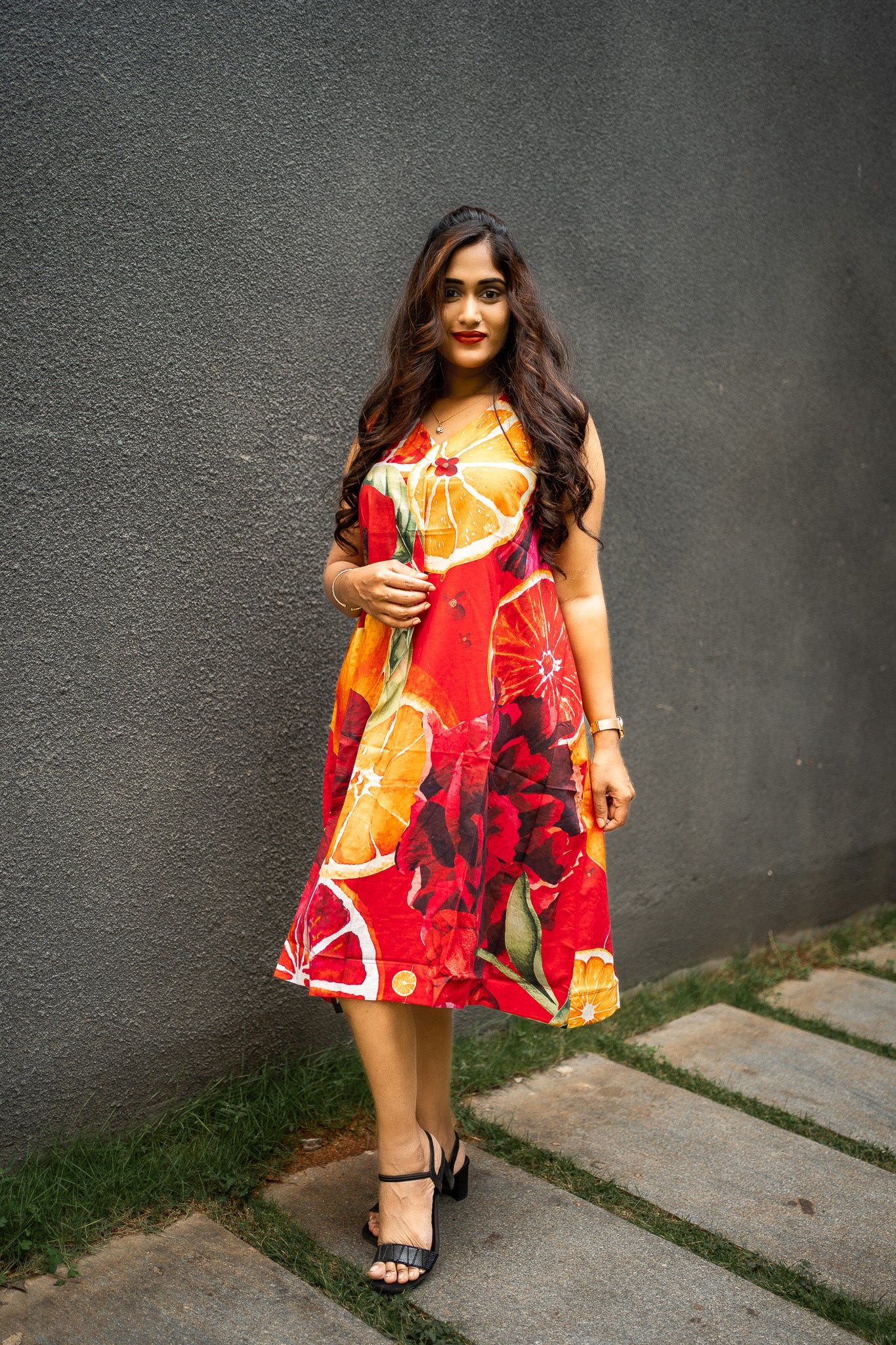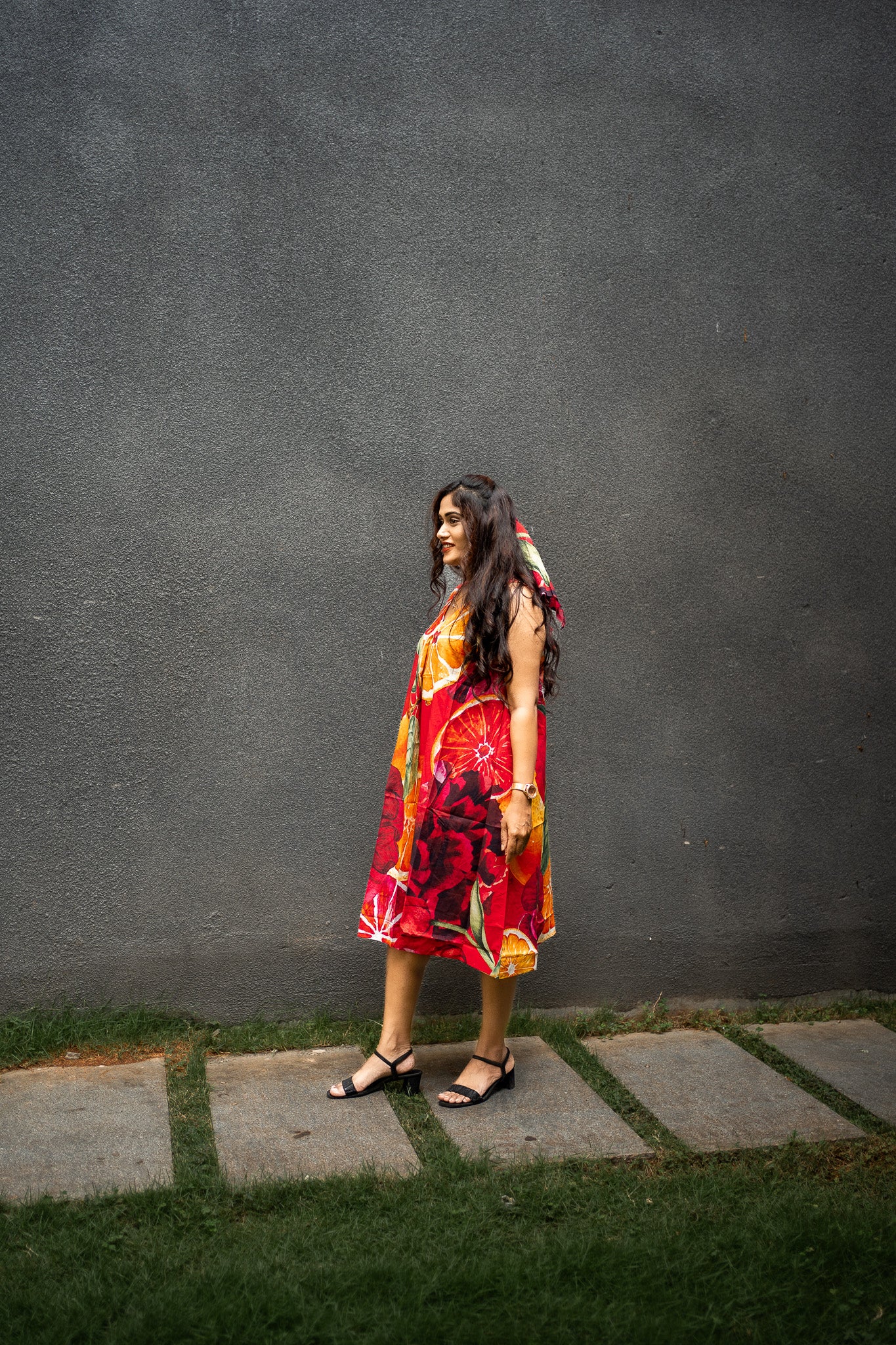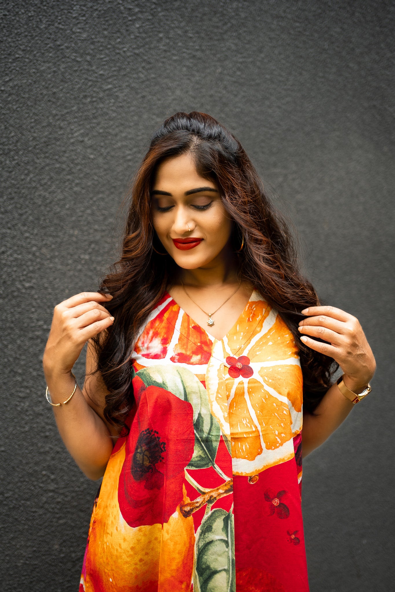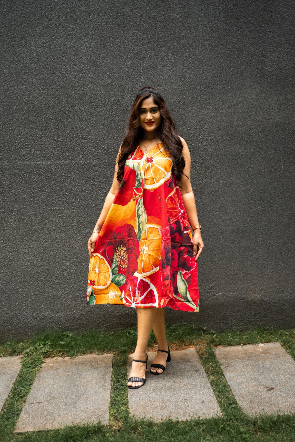 Featuring Orange and Red cotton BIG Bold Fruits and florals in our signature hand drawn prints from FRUVEE Collection.