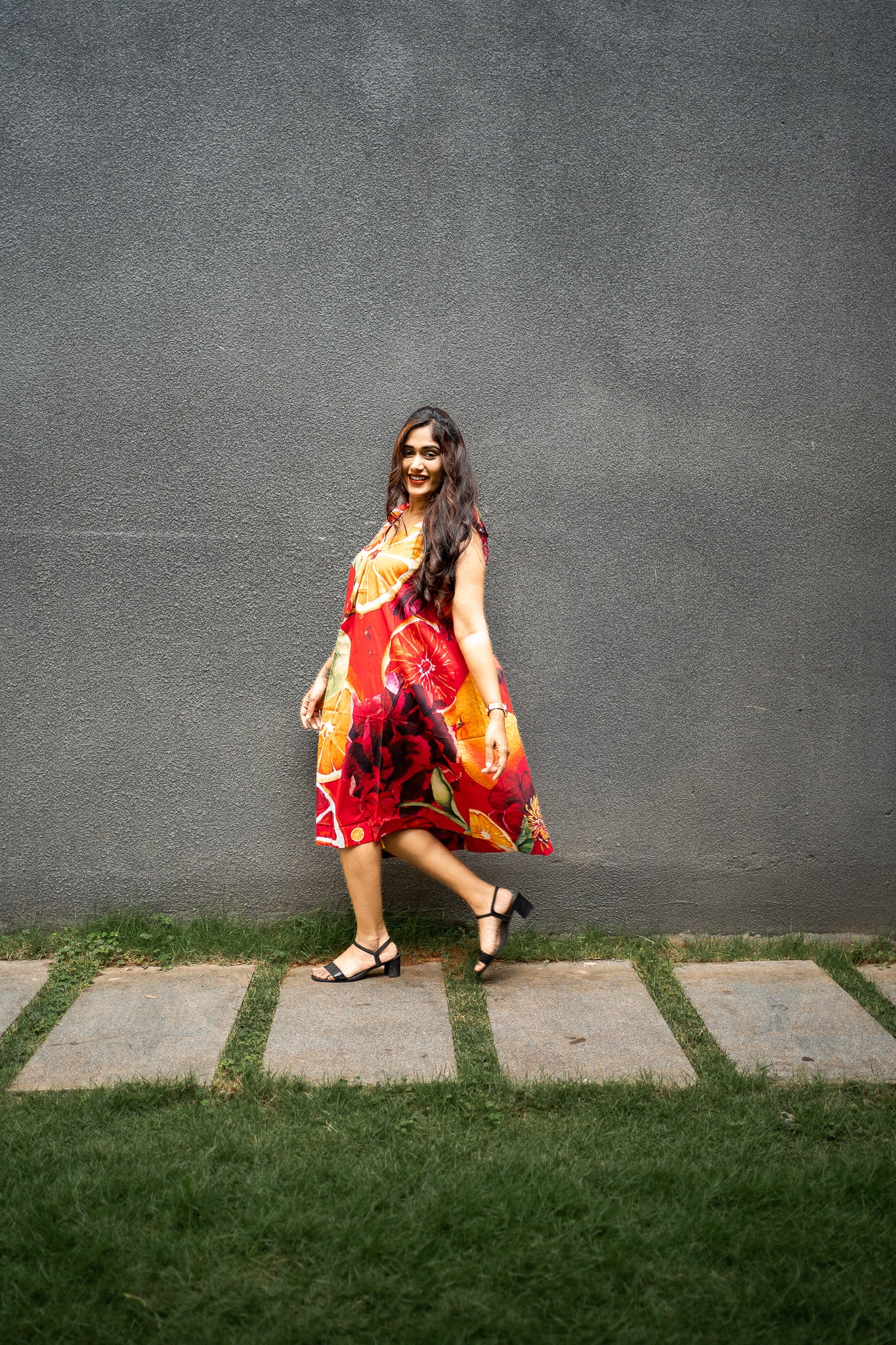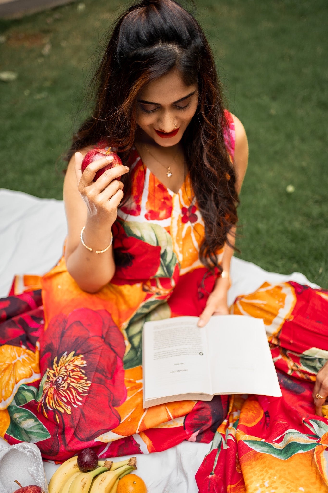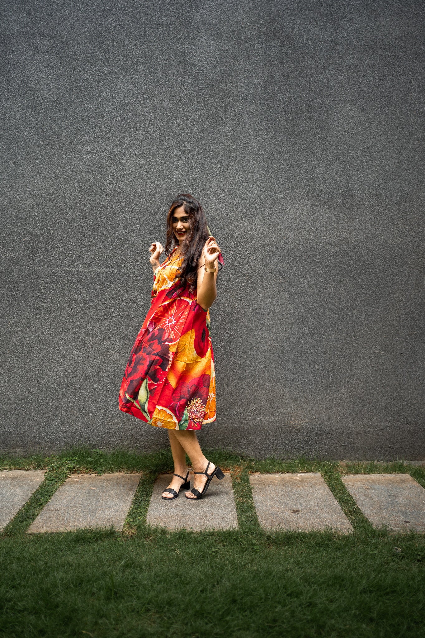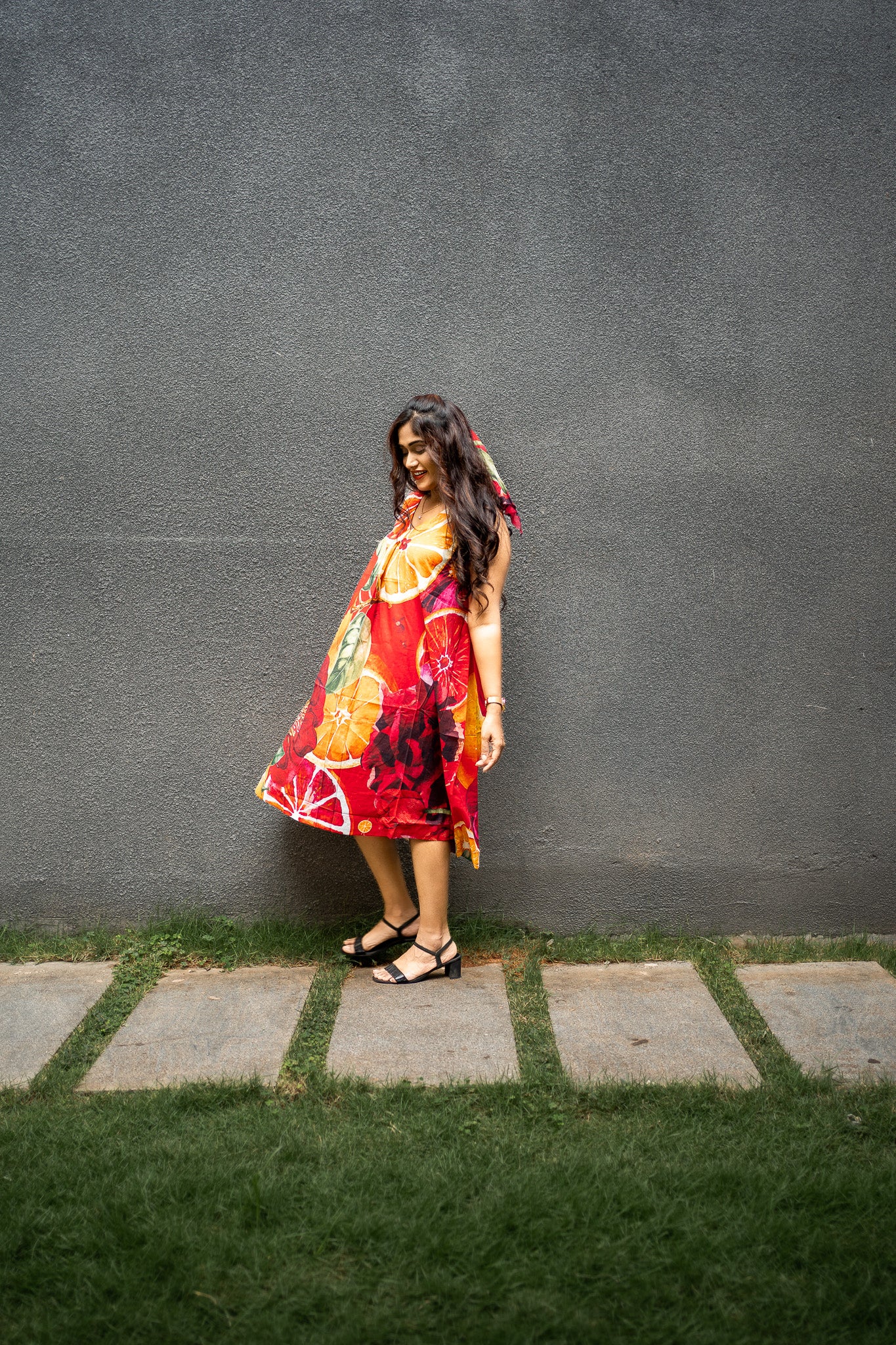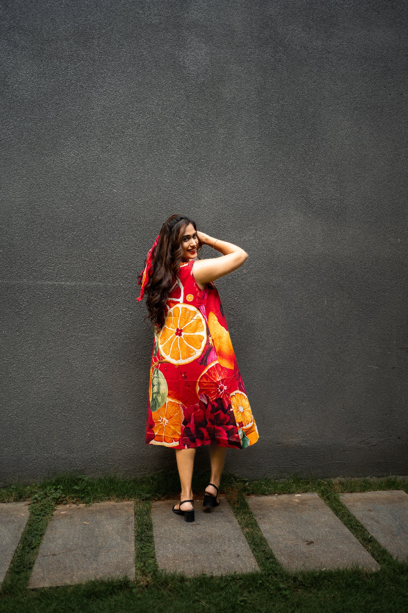 Featuring Orange and Red cotton BIG Bold Fruits and florals in our signature hand drawn prints from FRUVEE Collection.